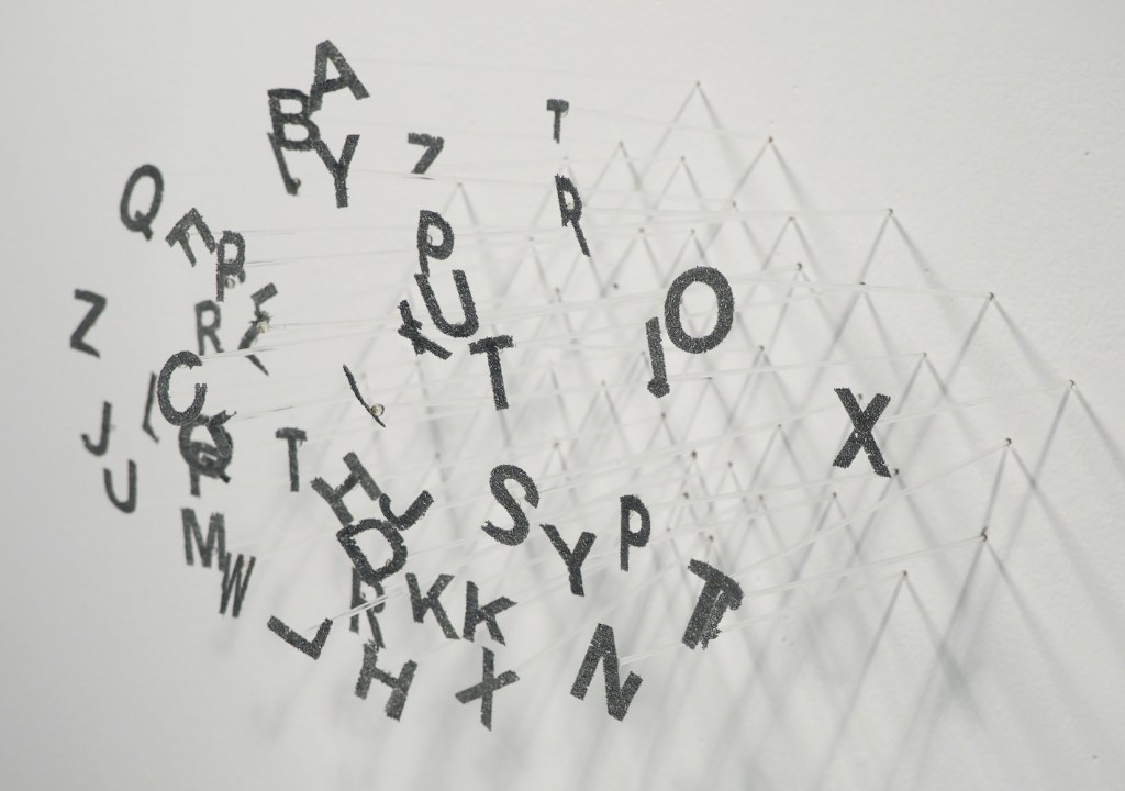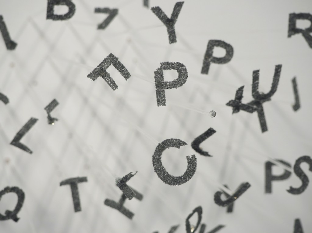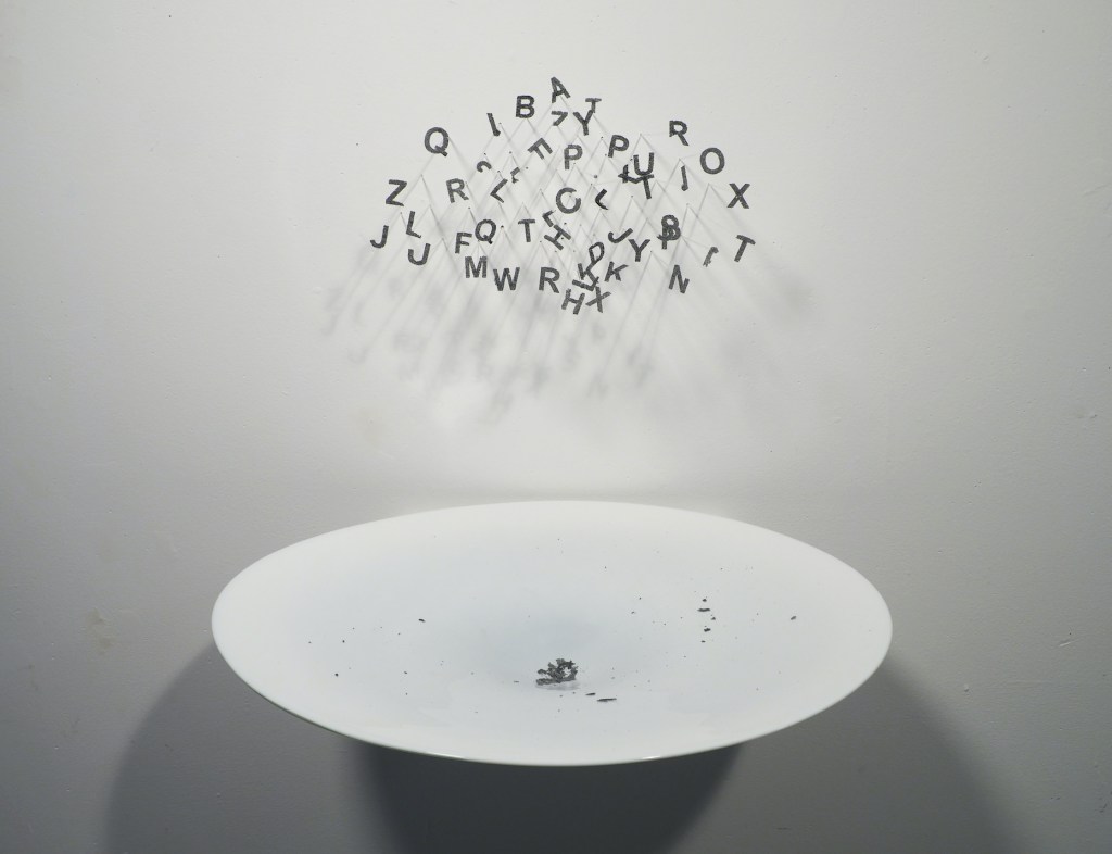 This work is made entirely of glass where the individual text is formed by a laser engraver. Rather than engraving onto solid glass, the laser runs across a smooth layer of glass powder leaving the surface of the powder tacked together. Each letter is then picked up and fused to a thin rod of glass. The viewer is presented with the passing of time as the letters fall apart into the bowl below.